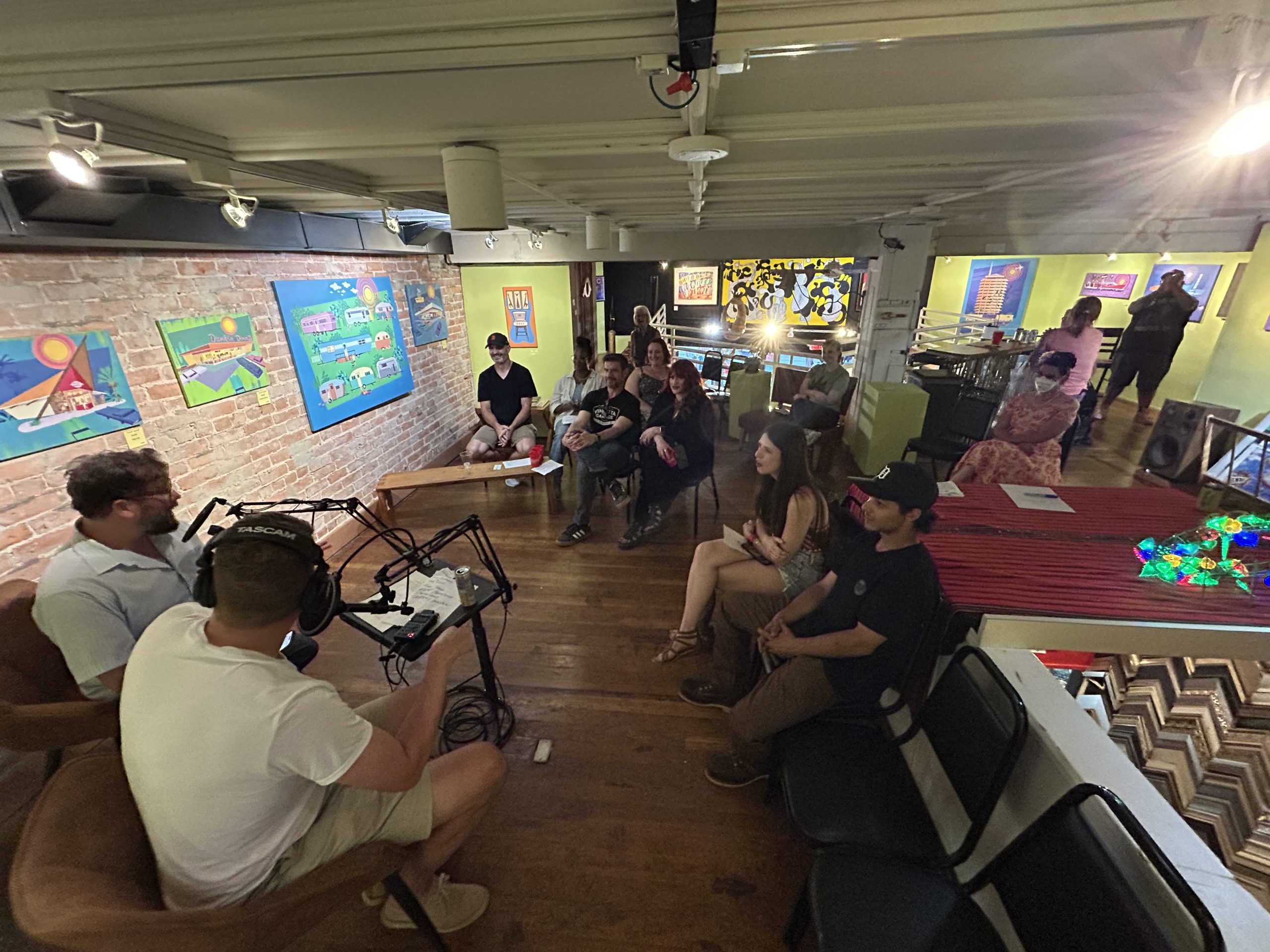 MI Michigan Story host Rob Prince interviews storyteller Drake Ficara at the June 2025 open-mic at Apothecary Espresso and Coffee in Farmington, Michigan.